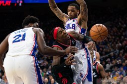 Pebasket Toronto Raptors Rondae Hollis-Jefferson (4) berebut bola dengan pebasket Philadelphia 76ers Joel Embiid (21) dan Josh Richardson (0) pada pertandingan NBA di Wells Fargo Center, Philadelphia, Senin (9/12/2019). ANTARA …