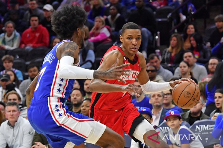 Pebasket Houston Rockets Jabari Smith Jr. (1) menggiring bola yang dihadang pebasket Philadelphia 76ers Jalen McDaniels (7) dalam pertandingan lanjutan NBA di Philadelphia, Pennsylvania, AS, Selasa (14/2/2023). Philadelphia 76ers menang atas tim tamunya Houston Rockets dengan skor 123-104. ANTARA FOTO/USA TODAY Sports via Reuters/Eric Hartline/nym.