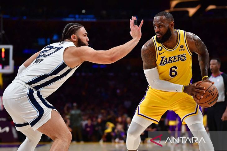 Pebasket Los Angeles Lakers LeBron James (6) mengontrol bola melewati hadangan pebasket Memphis Grizzlies David Roddy (27) pada pertandingan gim keempat NBA playoffs 2023 di Crypto.com, Los Angeles, California, AS (24/4/2023). Los Angeles Lakers berhasil mengalahkan Memphis Grizzlies dengan skor 117-111. ANTARA FOTO/Gary A. Vasquez-USA TODAY Sports via Reuters/aww.