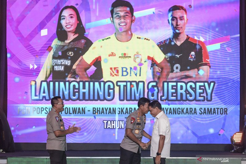 Kapolri Jenderal Pol Idham Azis (tengah) berjabat tangan dengan Menpora Zainuddin Amali (kanan) disaksikan Kakorlantas Polri yang juga CEO Bhayangkara FC, Pembina Povsivo Polwan dan Pembina Bhayangkara Samator Irjen Pol Istiono, …