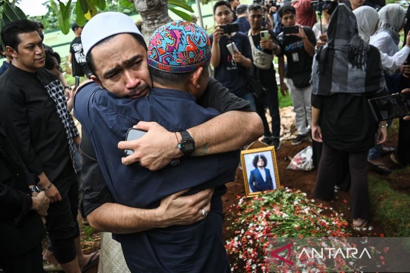 Sejumlah kerabat mengikuti prosesi pemakaman jenazah komedian Priya Prayogha Pratama alias Babe Cabita di TPU Kampung Gunung Cirendeu, Tangerang Selatan, Banten, Selasa (9/4/2024). Almarhum Babe Cabita meninggal dunia pada usia 34 tahun karena sakit. ANTARA FOTO/Sulthony Hasanuddin/tom.