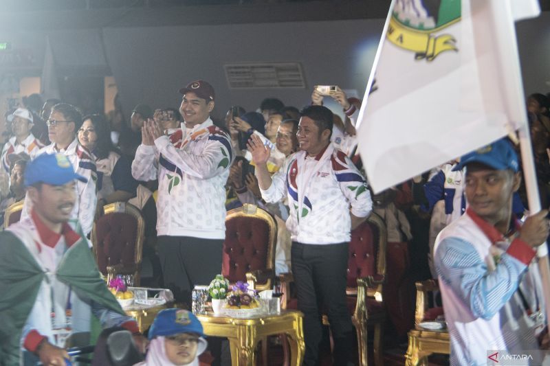 Menteri Pemuda dan Olahraga Dito Ariotedjo (kedua kiri) bersama Gubernur Sumatera Selatan Herman Deru (kedua kanan) menyaksikan defile kontingen atlet saat upacara pembukaan Pekan Paralympic Pelajar Nasional (Peparpenas) X Sumatera Selatan 2023 di Palembang Sport and Convention Center (PSCC), Palembang, Sumatera Selatan, Selasa (1/8/2023). Peparnas X Sumatera Selatan 2023 diikuti 711 atlet paralimpiade dari 25 provinsi dengan mempertandingkan enam cabang olahraga (cabor) dan memperebutkan 459 medali. ANTARA FOTO/Nova Wahyudi
