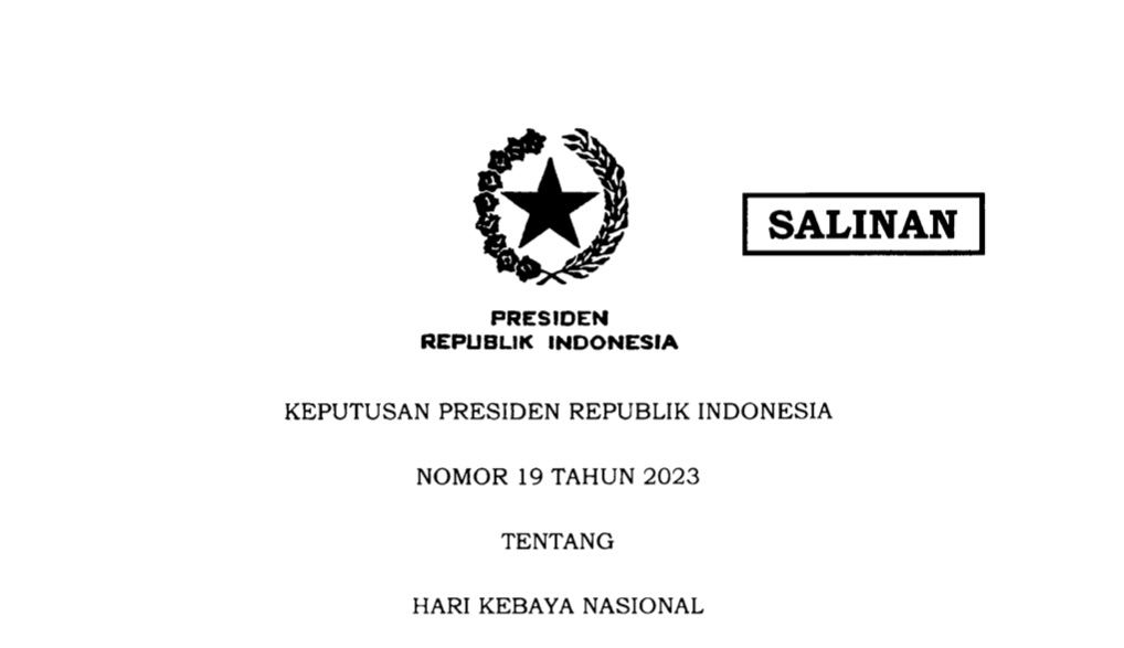 “Menetapkan tanggal 24 Juli sebagai Hari Kebaya Nasional,” bunyi Diktum Kesatu Keppres 19/2023 yang dapat diakses pada laman JDIH Sekretariat Kabinet tersebut.