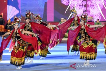 Sejumlah penerima Beasiswa Seni Budaya Indonesia (BSBI) menampilkan tarian tradisional Indonesia di Lapangan Banteng, Jakarta, Sabtu (12/8/2023). Sebanyak 45 penerima beasiswa dari 32 negara yang mengikuti program BSBI dari Kementerian Luar Negeri tersebut menampilkan hasil pembelajaran mereka selama dua bulan di Indonesia. ANTARA FOTO/M Risyal Hidayat/Spt.