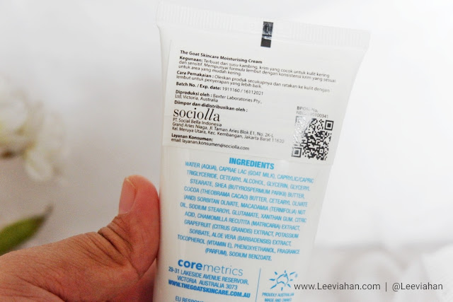 KLAIM PRODUK : Diformulasikan khusus untuk melembabkan dan menenangkan kulit, dapat digunakan untuk segala jenis kulit sensitif, kering, gatal dan menderita eksim. Terbuat dari susu kambing yang kaya akan kandungan Lactic Acid yang baik untuk kulit sensitif. Diproduksi dari peternakan kambing di Victoria, Australia. No Paraben, No Sulfat, Tanpa bahan kimia berbahaya, No animal Testing, Aman untuk ibu dan bayi.