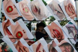 Syahroni (20) pedagang masker kain bergambar wajah membereskan barang dagangannya di Ciledug, Tangerang, Banten, Rabu (3/6/2020). Dalam satu hari Syahroni mampu menjual sepuluh sampai lima belas masker unik tersebut dengan harga …