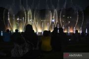 Sejumlah pengunjung menyaksikan pertunjukan air mancur menari dan atraksi formasi drone di danau Archipelago, Taman Mini Indonesia Indah (TMII), Jakarta, Minggu (18/2/2024). Pengelola TMII menyuguhkan pertunjukan air mancur menari dan atraksi formasi drone setiap hari untuk menghibur pengunjung yang berlibur. ANTARA FOTO/Erlangga Bregas Prakoso/YU