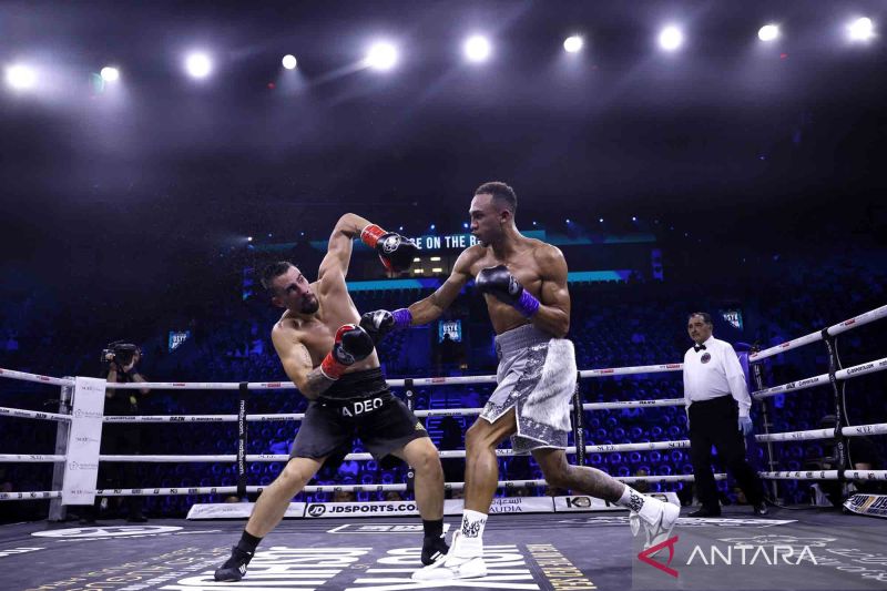 Petinju Inggris Ben Whittaker (kanan) melancarkan pukulan ke arah Petinju Kroasi Petar Nosic dalam pertandingan tinju dunia perebutan sabuk juara kelas berat ringan di Kompleks Olah Raga King Abdullah, Jeddah, Saudi Arabia, Sabtu (20/8/2022). Ben Whittaker menang dengan angka mutlak (unanimous decision) atas lawannya Petar Nosic dalam pertandingan yang digelar enam ronde tersebut. ANTARA FOTO/Action Images/Andrew Couldridge/via REUTERS/wsj.