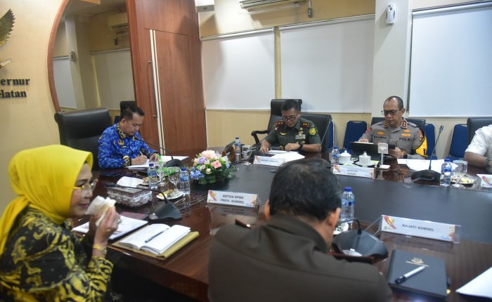 Kapolda Sumsel, Irjen Pol A. Rachmad Wibowo, Sik, bersama Penjabat (Pj) Gubernur Sumsel, Dr. Agus Fatoni, MSi, dan Forkopimda Provinsi Sumsel, menghadiri Rapat Koordinasi (Rakor) terkait Isu-Isu Strategis dalam Pelaksanaan Pemilihan Kepala Daerah (Pilkada). Acara ini digelar di Ruang Rapat Gubernur Sumsel pada Rabu, (17/4).(BP/IST)Palembang, BP- Kapolda Sumsel, Irjen Pol A. Rachmad Wibowo, Sik, bersama Penjabat (Pj) Gubernur Sumsel, Dr. Agus Fatoni, MSi, dan Forkopimda Provinsi Sumsel, menghadiri Rapat Koordinasi (Rakor) terkait Isu-Isu Strategis dalam Pelaksanaan Pemilihan Kepala Daerah (Pilkada). Acara ini digelar di Ruang Rapat Gubernur Sumsel pada Rabu, (17/4).