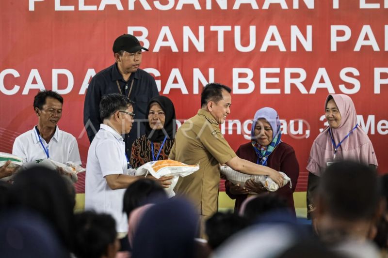Lubuk Linggau (ANTARA) – Penjabat (Pj) Gubernur Sumatera Selatan Agus Fatoni (tengah) menyerahkan Bantuan Pangan Cadangan Beras Pemerintah kepada keluarga penerima manfaat saat ditinjau oleh Presiden Joko Widodo di Gudang Bulog Lubuklinggau, Sumatera Selatan, Kamis (30/5/2024). Presiden meninjau persediaan beras dan proses penyaluran bantuan pangan cadangan beras pemerintah kepada keluarga penerima manfaat. ANTARA FOTO/Nova Wahyudi/nym.