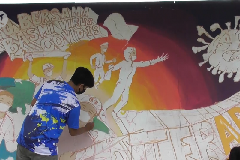 ANTARA – Polda Jawa Tengah membuka ruang bagi masyarakat untuk menyampaikan aspirasi melalui lomba mural yang digelar di halaman Mapolda Jateng, Sabtu (30/10). Lomba mural yang diadakan serentak bertajuk Bhayangkara Mural Festival 2021 tersebut, merupakan wadah untuk mengekspresikan kritik melalui kreasi seni lukis. (Fx. Suryo Wicaksono/Arif Prada/Rinto A Navis)