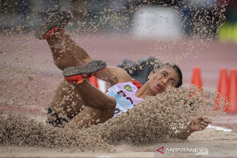 Pelompat jauh Bali Maria Natalia Londa bertanding dalam babak final lompat jauh putri cabang atletik PON Papua di Stadion Atletik Mimika Sport Center, Kabupaten Mimika, Papua, Selasa (5/10/2021). Maria Londa meraih medali emas dalam nomor tersebut, sementara medali perak diraih atlet Nusa Tenggara Barat (NTB) Rohani dan medali perunggu diraih atlet Papua Vinsensia Awutet Amjaram. ANTARA FOTO/Aditya Pradana Putra/pras.