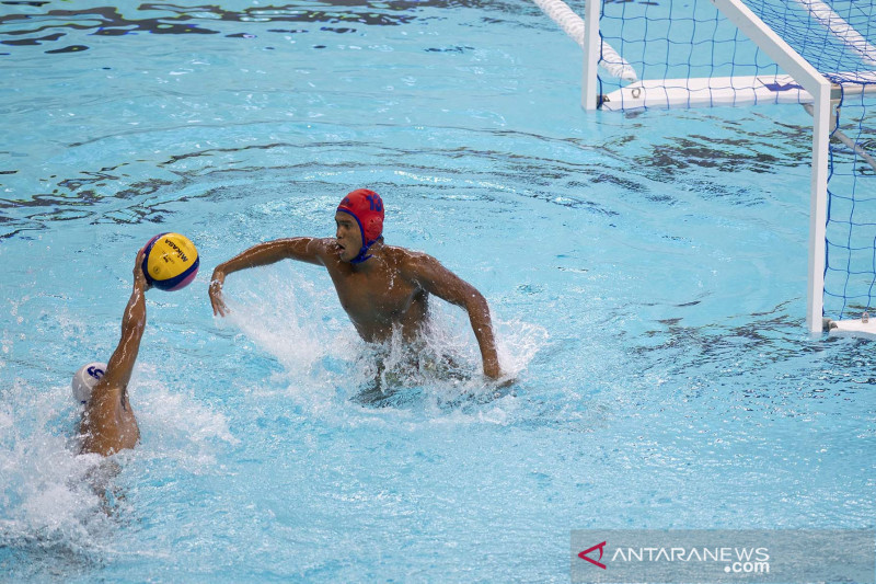 Atlet polo air putra Jawa Barat M Zein Dzaki Julian (kiri) berusaha memasukan bola ke gawang tim polo air Papua yang dijaga Eldin Novrizal (kanan) saat pertandingan Polo Air Putra PON Papua di Stadion Akuatik, Kampung Harapan, Kabupaten Jayapura, Papua, Selasa (28/9/2021). Tim polo air putra Jawa Barat berhasil mengalahkan tim polo air putra Papua dengan skor 20-12. ANTARA FOTO/M Agung Rajasa/pras.