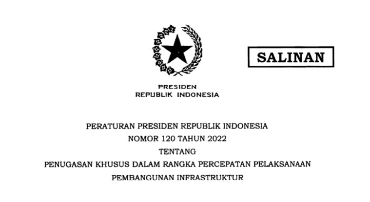 Pemerintah menerbitkan Peraturan Presiden Republik Indonesia (Perpres) Nomor 120 Tahun 2022 tentang Penugasan Khusus dalam rangka Percepatan Pelaksanaan Pembangunan Infrastruktur. Peraturan tersebut ditetapkan oleh Presiden RI Joko Widodo (Jokowi) pada tangga 27 September 2022.