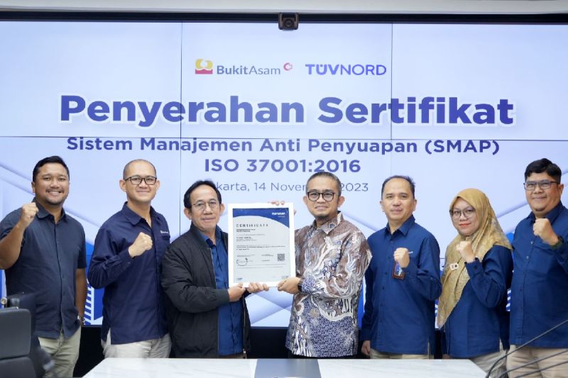 Jakarta (ANTARA) – PT Bukit Asam Tbk (PTBA), anggota Grup MIND ID, berhasil mempertahankan sertifikasi Sistem Manajemen Anti Penyuapan (SMAP) ISO 37001:2016 berdasarkan hasil audit dari PT TUV NORD Indonesia selaku Badan Sertifikasi Independen.