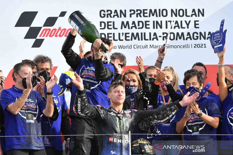 Pebalap Monster Energy Yamaha MotoGP Fabio Quartararo merayakan gelar juara dunia MotoGP 2021 bersama tim usai balapan MotoGP Emilia Romagna di Misano World Circuit Marco Simoncelli, Misano, Italia, Minggu (24/10/2021). Pada MotoGP Emilia Romagna yang dimenangkan Marc Marquez tersebut, Quartararo berhasil mengunci gelar juara dunia MotoGP 2021 setelah terjadi crash yang dialami Fransesco Bagnaia. ANTARA FOTO/REUTERS/Jennifer Lorenzini/rwa.