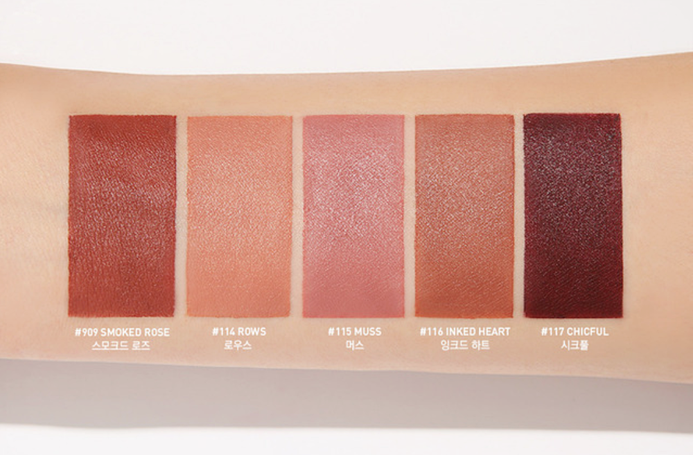 Seluruhnya ada 5 warna yang tersedia, yaitu 909 Smoked Rose, 114 Rows, 115 Muss, 116 Inked Heart, dan 117 Chicful. Untuk warnanya yang unik menurut keterangan di website Stylenanda, Smoked Rose merupakan warna mawar merah bata yang memberikan suasana wanita yang menyejukkan. Di antara kelima warna tersedia saya jatuh cinta dengan warna Smoked Rose karena sedang mencari lipstik cokelat, sedikit gelap, dan memiliki warna yang tegas. Selain itu saya juga kepikiran lipstik ini terus saat melihat Lily Maymac menggunakannya dan termasuk warna yang dipilih Lily. Cantik banget saat dipakai!