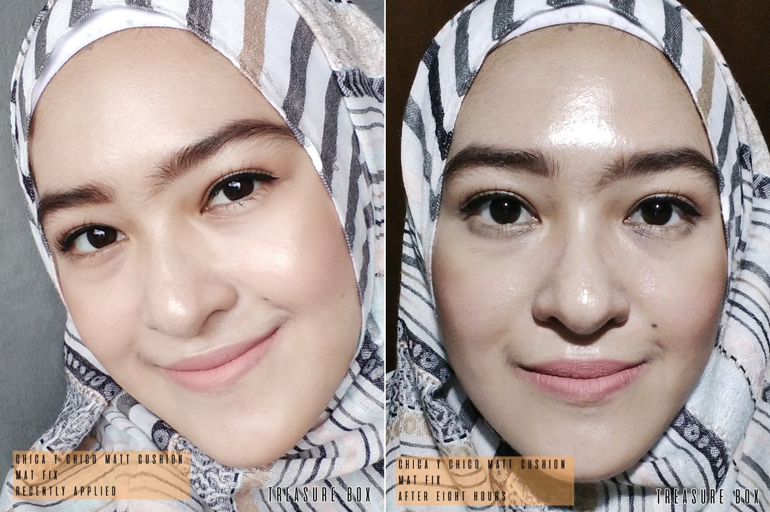 Chica Y Chico Matt Cushion Mat Fix memiliki ketahanan untuk coveragenya yang cukup baik di wajah saya selama lebih dari 8 jam kecuali daerah hidung, kumis, dan sekitar bibir. Tapi sayangnya warnanya tidak seperti saat penggunaan awal. Tidak gelap sekali tapi mengalami penurunan warna dan matte berubah menjadi dewy, hmm glossy sih sebenernya kalau di kamera. Untuk daerah sekitar bibir terlihat jelas sekali terutama bila menggunakan lipstik dengan warna kontras atau bila foto di zoom kalau sekitar bibir ini tidak tertutup oleh Mat Fix. Penyebabnya saya kurang tahu, karena hal ini juga berulang saat saya menggunakan primer. Mungkin bulu-bulu halus di sekitar bibir ya.