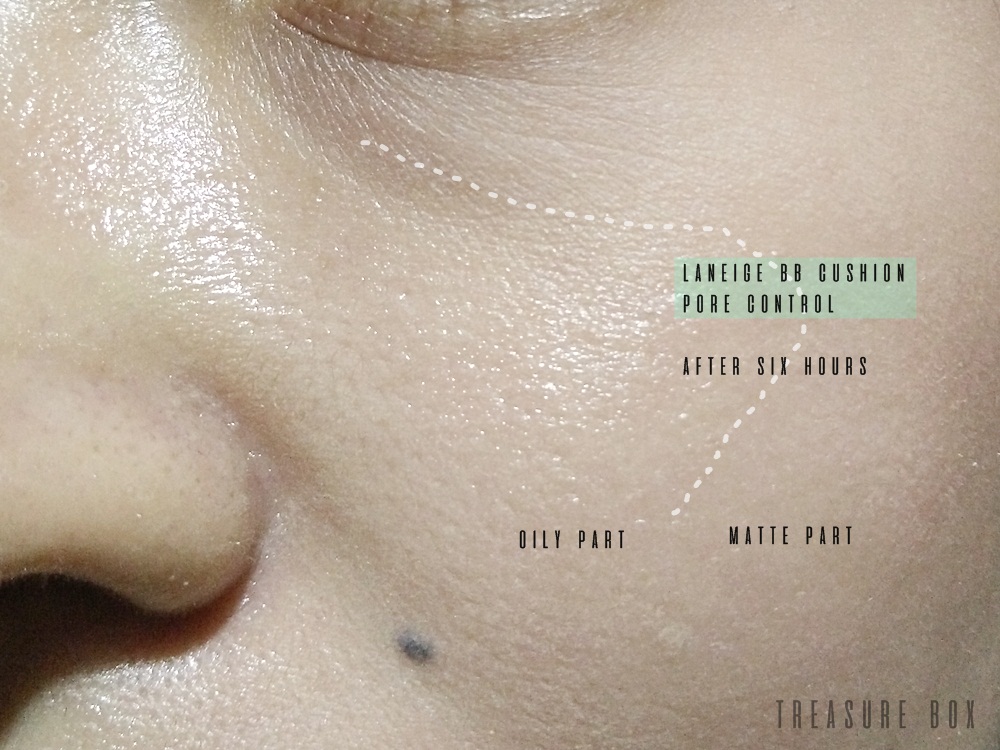 Karena aktivitas saya hanya di ruangan berAC saja jadi Laneige BB Cushion Pore Control cukup bagus untuk seluruh wajah 8 jam wajah tidak berminyak, kecuali bagian hidung hanya bertahan sekitar 3 jam saja. Warnanya juga tidak menggelap dan tetap segar seperti awal pemakaian.