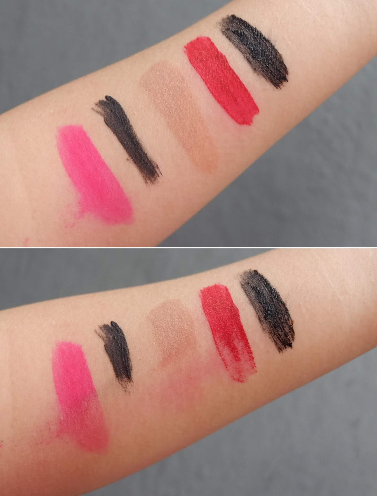 swatch beberapa jenis makeup eyeliner, mascara waterproof, lipstick dan foundation sampai kering menempel banget, kayak pas saya lagi makeup berjam-jam. Hasilnya bisa