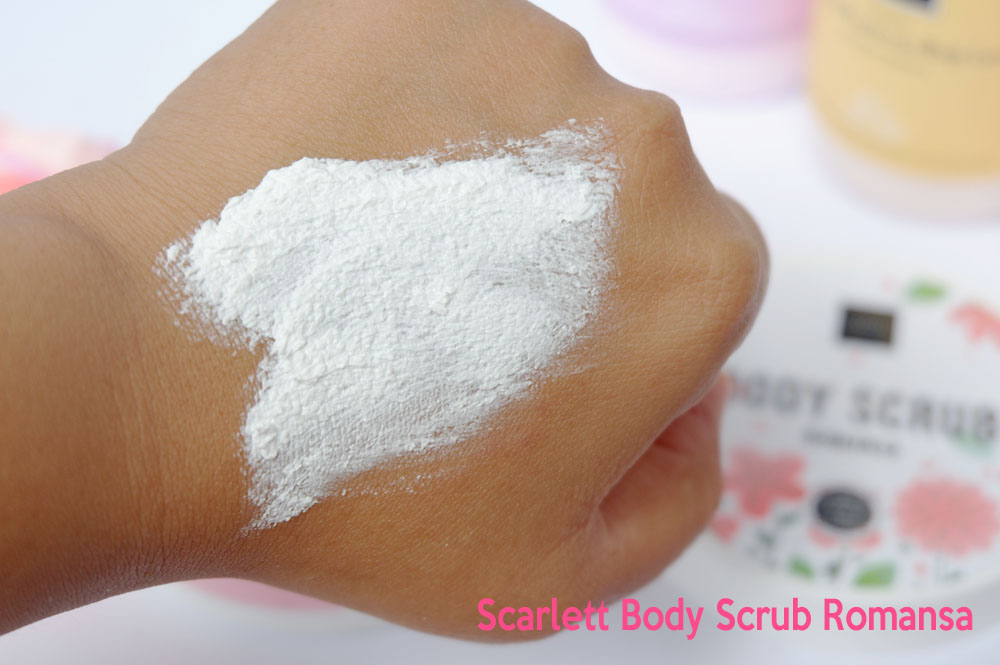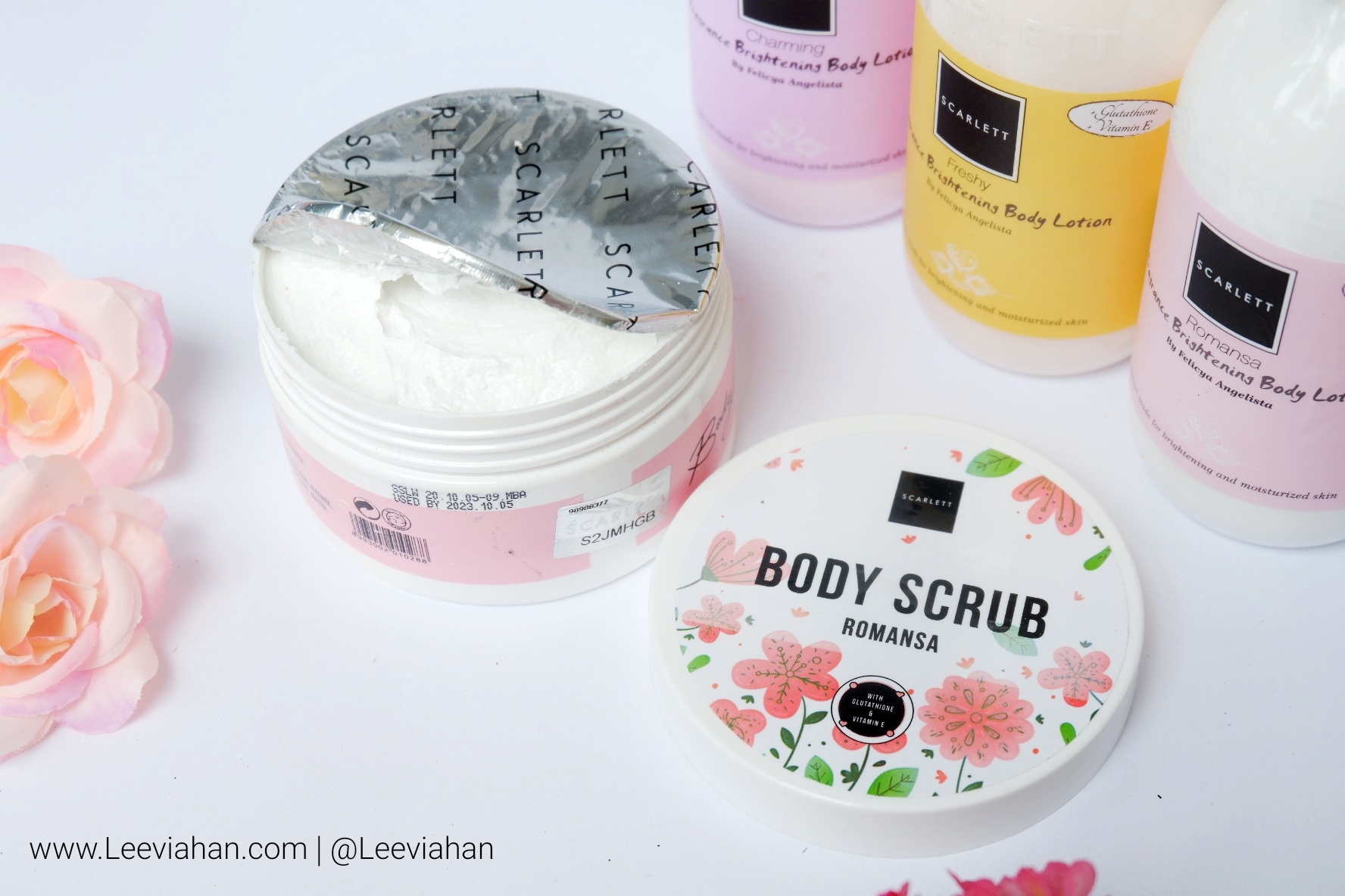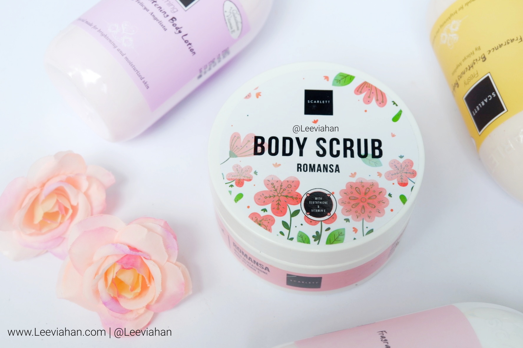 Produk pertama saya bahas body scrub, saya mau bahas secara berurutan sesuai aturan saya kalau lagi perawatan badan. Body scrub Scarlett ini dia ngeluarin 2 varian aroma Romansa dan Pomegrante. Tapi yang saya coba saat ini Romansa. Dia dikemas dengan kemasan jar putih dengan pattern bunga berwarna coral yang mempermanis tampilan kemasan diatas tutupnya. Sayangnya saya enggak nemuin netto produknya di kemasan. Mungkin bisa ditambahin keterangan netto kedepannya?