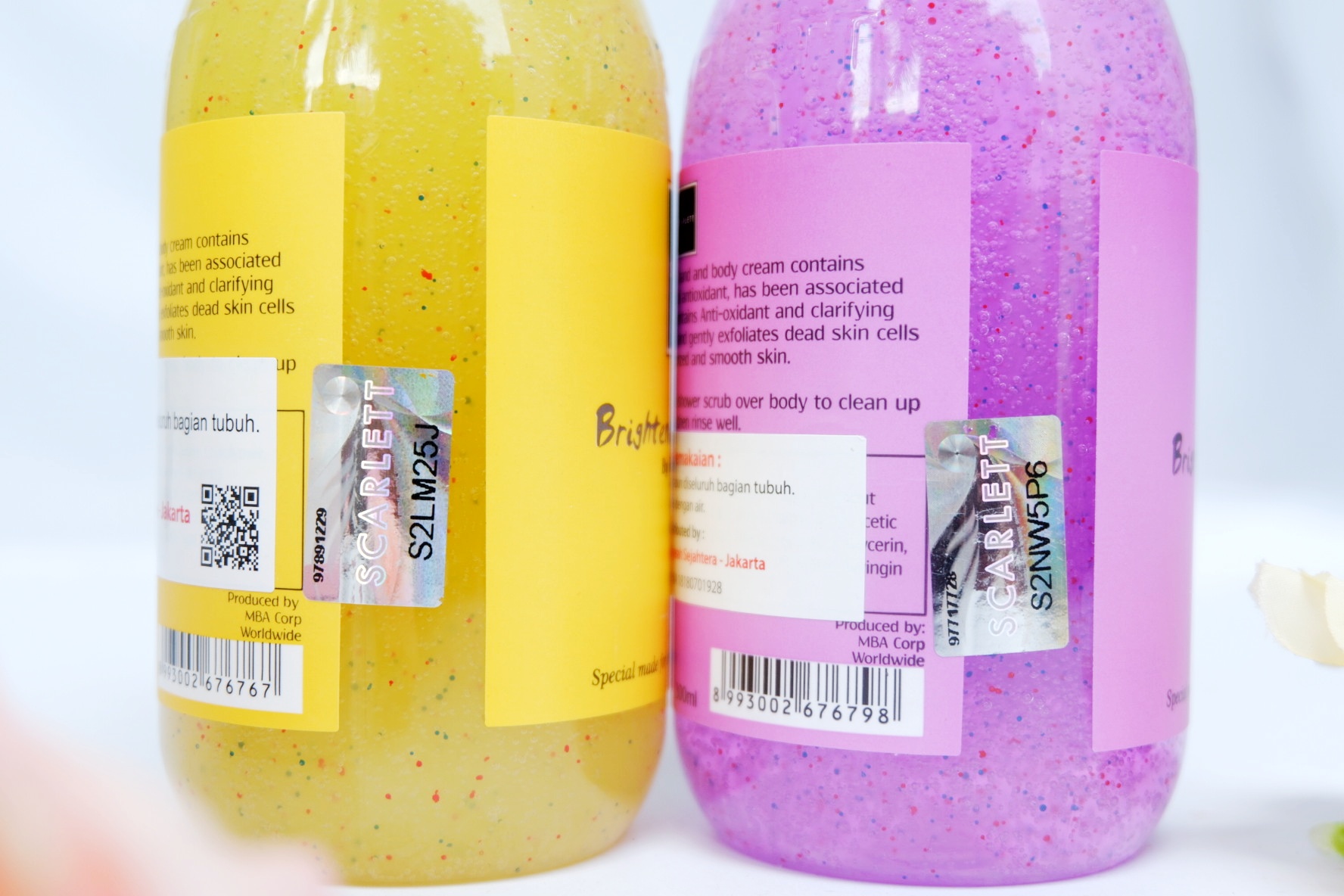 Dibadan kemasan terdapat keterangan produknya seperti Ingredients, cara pemakaian, nomor BPOM, QR code, barcode dan logo halal. Juga tetep ada stiker hologramnya, yang terdapat huruf dan angka yang digunakan untuk mengecek keaslian produk di website resmi Scarlett.