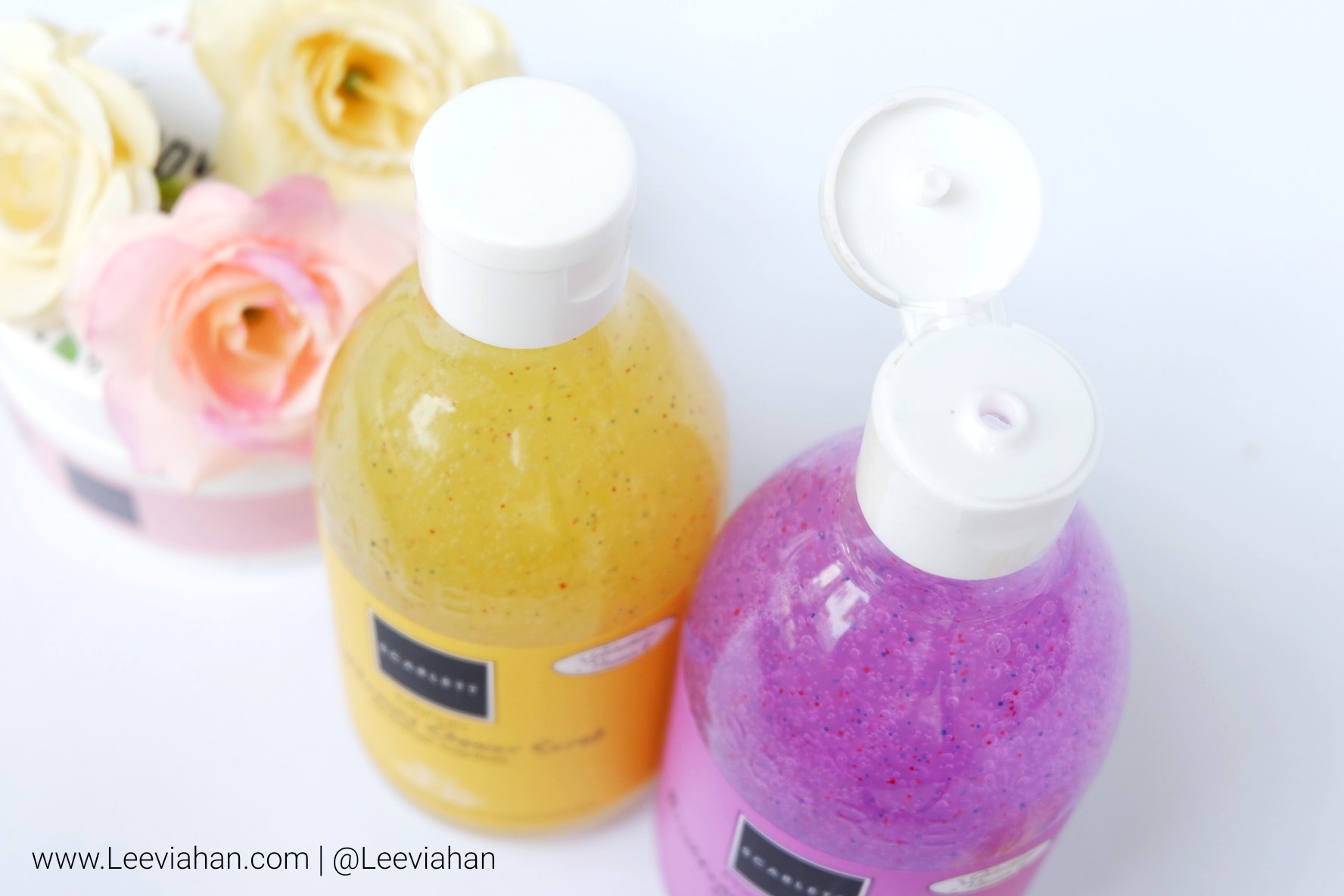 Selanjutnya ada body shower scrub. Scarlett ngeluarin rangkaian shower scrubnya ada 3 aroma wangi, ada Pomegrante, Mango dan Cucumber. Hanya disini saya enggak punya aroma cucumbernya. Kemasannya dibalut dalam botol plastik dengan isi produk 300ml. Nah ini baru ada keterangan isi produknya. Botol kemasan plastiknya ini transparan gaes. Jadi bisa terlihat dari luar warna dari masing-masing variannya.