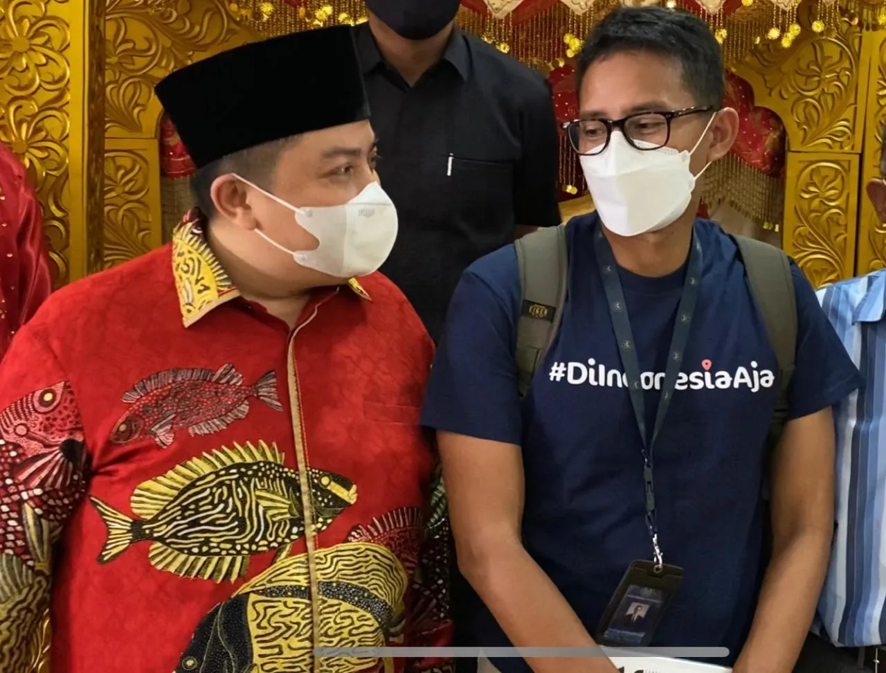 SAWAHLUNTO, METRO—Menteri Pariwisata dan Ekonomi Kreatif (Menparekraf) Sandiaga Uno mendoakan anggota DPRD Sumbar Irwan Afriadi menjadi ketua Partai NasDem Sumbar. Hal itu disampaikanny dalam temu ramah Sandi dengan Wali Kota Sawahlunto Deri Asta yang juga dihadiri Anggota DPR RI Andre Rosiade, Kamis (22/4) malam di Museum Gudang Ransum Sawahlunto.