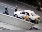 Namun, pengemudi mobil sedan putih sedikit menginjak gasnya sehingga sekuriti marah dan memukul kap mobil tersebut.