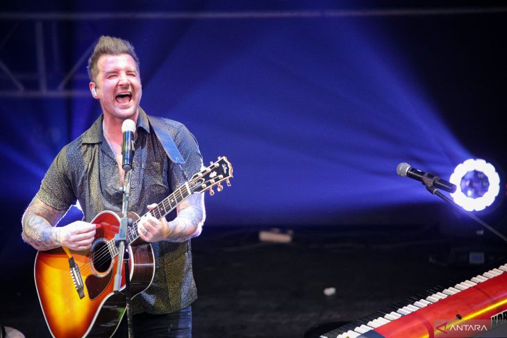 Vokalis band Secondhand Serenade John Vasely beraksi pada Musicverse Live #11 di Surabaya, Jawa Timur, Jumat (10/3/2023). Band beraliran rock akustik asal Amerika Serikat tersebut membawakan 15 lagu diantaranya Fall For You, Stranger, dan Awake. ANTARA FOTO/Rizal Hanafi/foc.