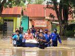 Kepolisian Daerah (Polda) Sumatera Utara mengerahkan personelnya untuk membantu mengevakuasi warga korban banjir menggunakan perahu karet.