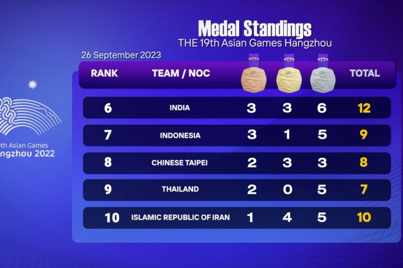 ANTARA – Indonesia berada di posisi ketujuh perolehan sementara medali dalam ajang Asian Games Hangzhou 2022, Selasa (26/9). Indonesia total meraih sembilan medali dengan rincian tiga medali emas, satu medali perak, dan lima medali perunggu.