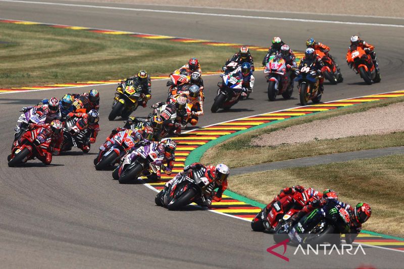 Pembalap Monster Energy Yamaha MotoGP Fabio Quartararo memacu kecepatan sepeda motornya saat balapan MotoGP German Grand Prix di Sachsenring, Hohenstein-Ernstthal, Jerman, (19/6/2022). Fabio Quartararo tampil dominan dan berhasil menjadi juara pertama diikuti pembalap Pramac Ducati Johann Zarco dan pembalap Ducati Lenovo Jack Miller. ANTAR FOTO/REUTERS/Lisi Niesner/aww.