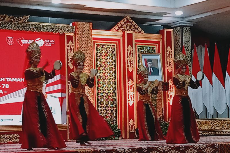 Palembang (ANTARA) – Persembahan tarian Zapin Rebab pada malam Resepsi Kenegaraan & Ramah Tamah” dalam rangka HUT ke-78 RI di Griya Agung Istana Gubernur Sumsel di Palembang, Kamis malam. Hadir Gubernur Sumsel Herman Deru, Paskibraka, veteran, BUMN/BUMD, tokoh masyarakat dan undangan lainnya. (Antara/Syarif Abdullah).