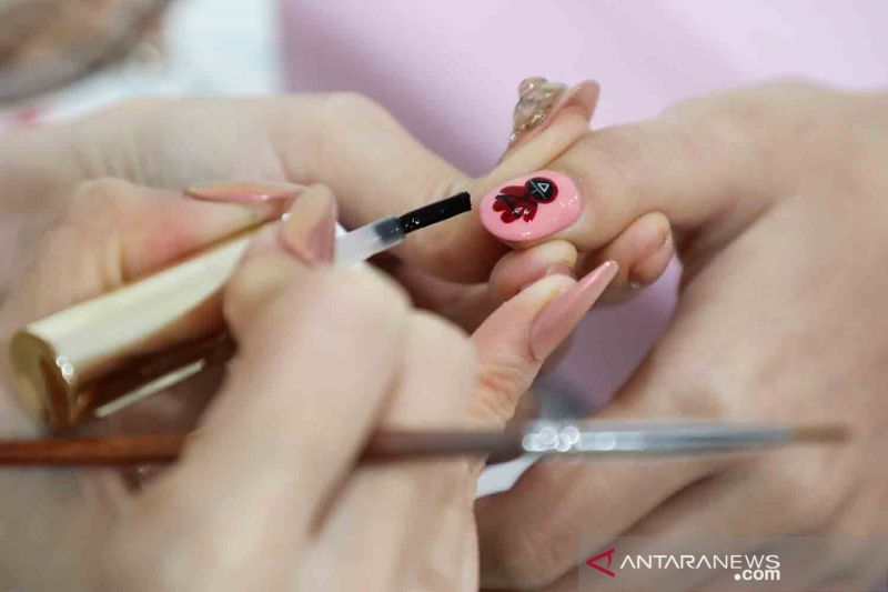 Pemilik gerai manikur Lim Pei Xin mengerjakan manikur Squid Game untuk kliennya di Kuala Lumpur, Malaysia, Kamis (14/10/2021). Serial Korea Selatan tentang permainan bertahan hidup yang brutal tersebut viral hampir di seluruh dunia dan berpeluang mengalahkan popularitas Bridgerton sebagai serial orisinal terbesar di Netflix sepanjang masa. ANTARA FOTO/REUTERS/Lim Huey Teng/rwa.
