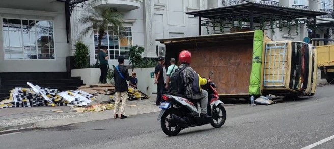 Palembang, BP– Kecelakaan tunggal terjadi di Jalan Kapten Marzuki Ilir Timur I Palembang Rabu (1/11) sekitar pukul 09:00 WIB. Truk BG 8534 IQ bermuatan bahan untuk lantai hotel Luminor terbalik setelah penutup drainase patah.
