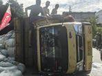 Untuk menghindari terjadinya tabrakan, sopir truk terpaksa banting stil dan terguling.
