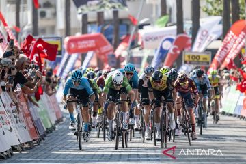 Pembalap sepeda berkompetisi di etape Fethiye-Marmaris pada Tur Bersepeda Kepresidenan Turkiye ke-58 di Mugla, Turkiye, Rabu (11/10/2023). Dimulai dari distrik Alanya di kota resor Mediterania Antalya, dan berakhir di Istanbul pada Minggu (15/10), diikuti total 168 pembalap sepeda dari 36 negara akan menempuh jarak 1.235 kilometer dalam lomba delapan hari. ANTARA FOTO/REUTERS/Cem Tekkesinoglu/Spt.