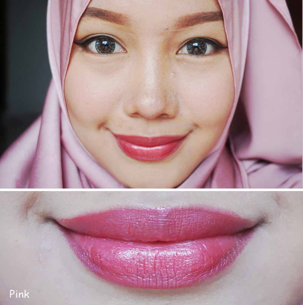 Disini saya menggunakan warna pink tapi jatuhnya pink tua atau lebih mendekati ke warna fuchsia, tapi berhubung bibir saya ini dasarnya berwarna pinggiran coklat pas lipstick ini diaplikasikan jadi berwarna pink agak ke merah soft, karna emang kalau kita punya dasar bibir warnanya coklat lipstick akan berubah juga sedikit. Dan tambahannya lagi lipstick ini shimmernya lebih merata yang bikin efek kilap dibibir lebih keluar.
