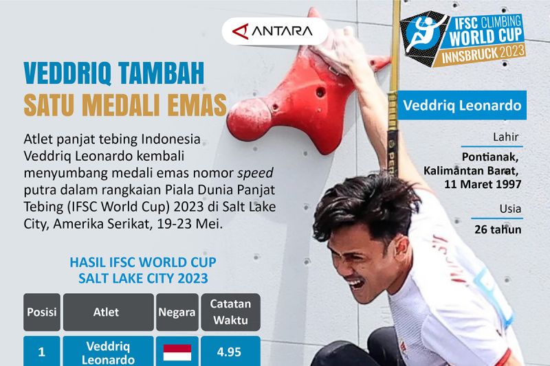 Atlet panjat tebing Indonesia Veddriq Leonardo kembali menyumbang medali emas nomor speed putra dalam rangkaian Piala Dunia Panjat Tebing (IFSC World Cup) 2023 di Salt Lake City, Amerika Serikat, 19-23 Mei.