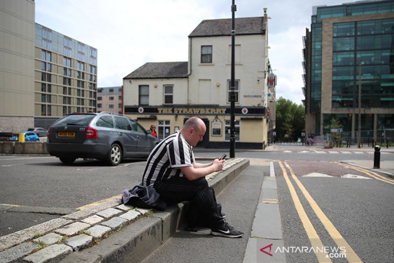 Seorang pendukung menyaksikan pertandingan melalui telepon selularnya di luar stadion saat laga tertutup Liga Inggris akibat COVID-19 antara Newcastle United bertanding melawan Sheffield United di St James Park, Newcastle, …